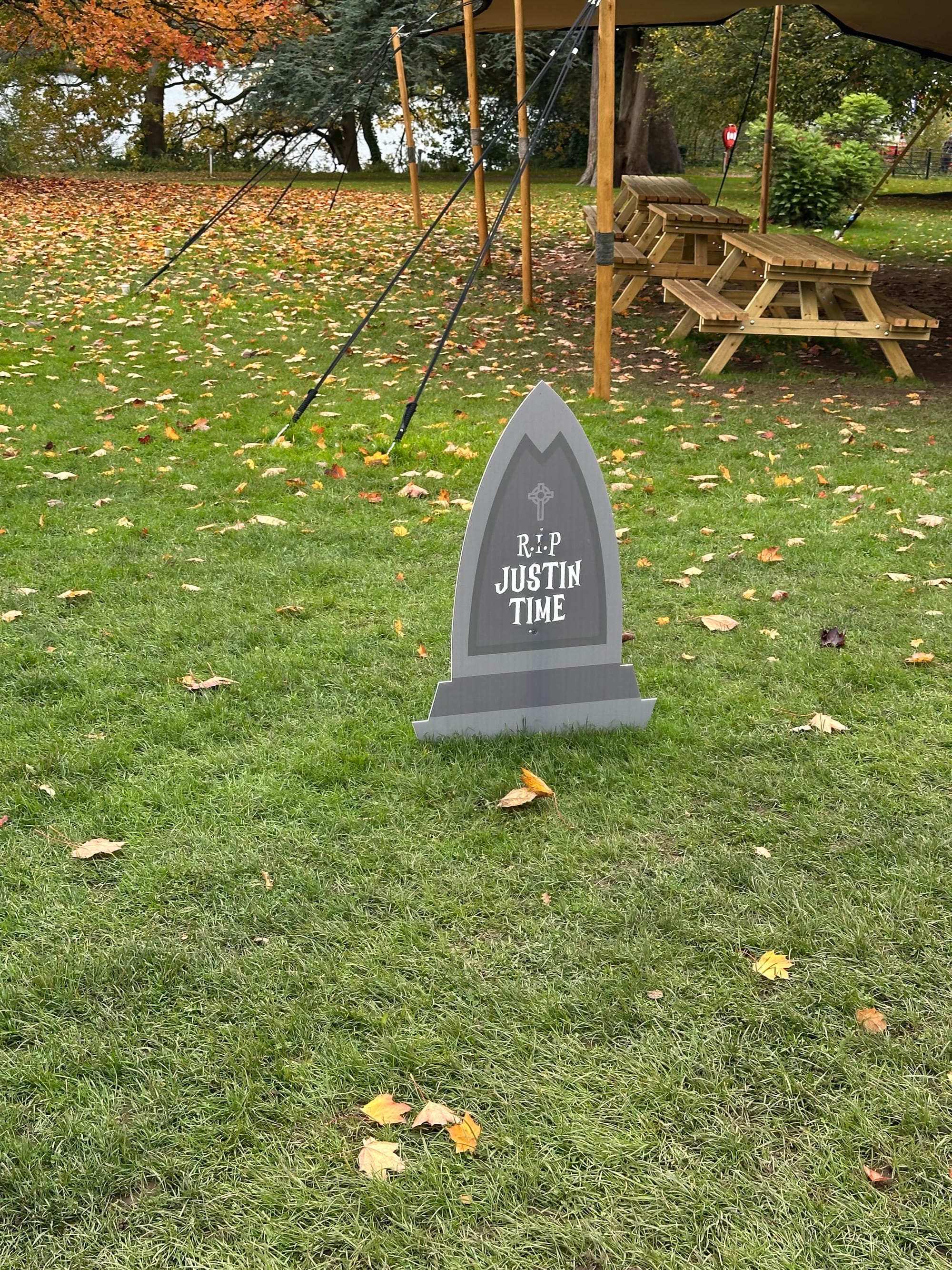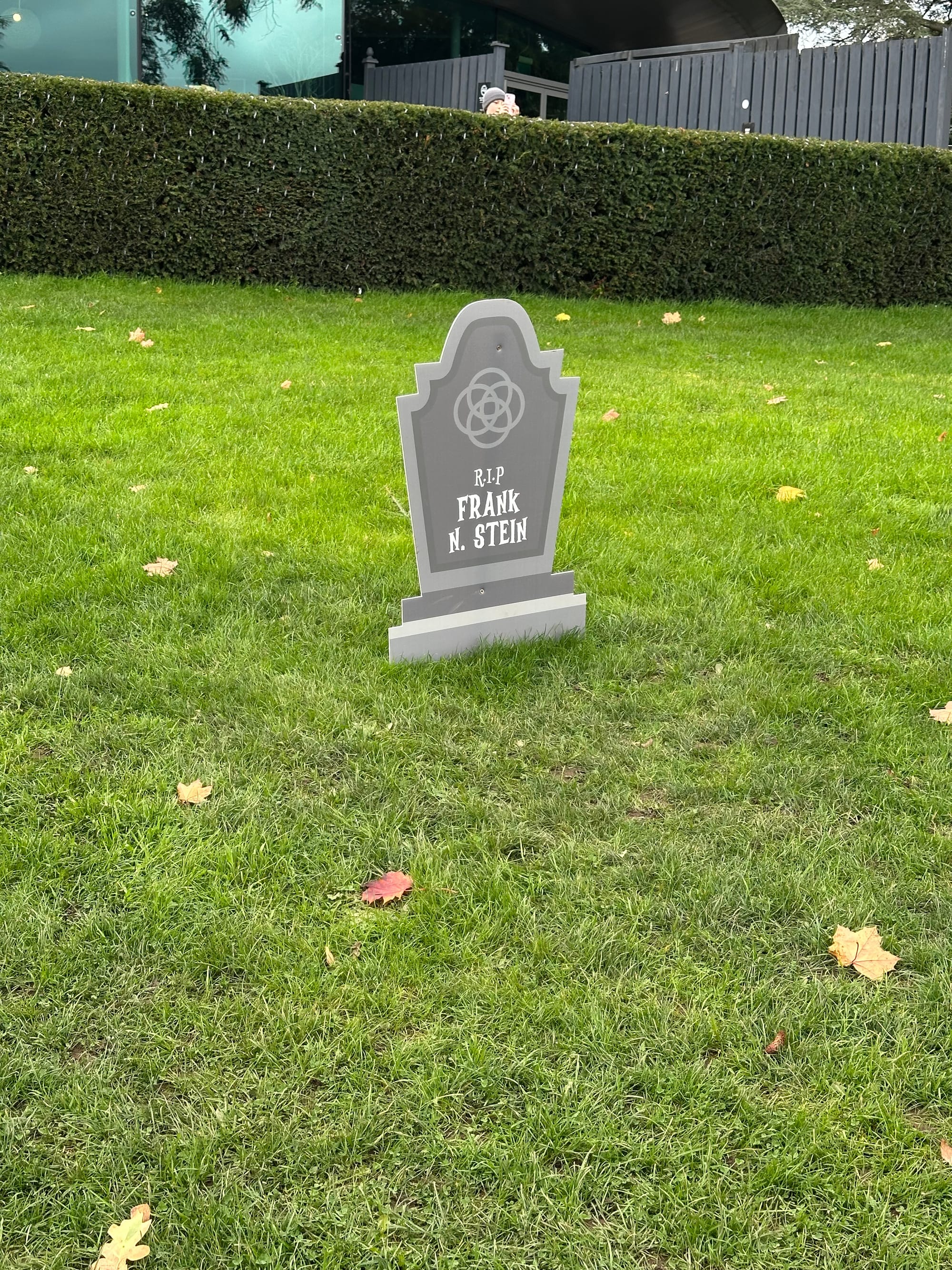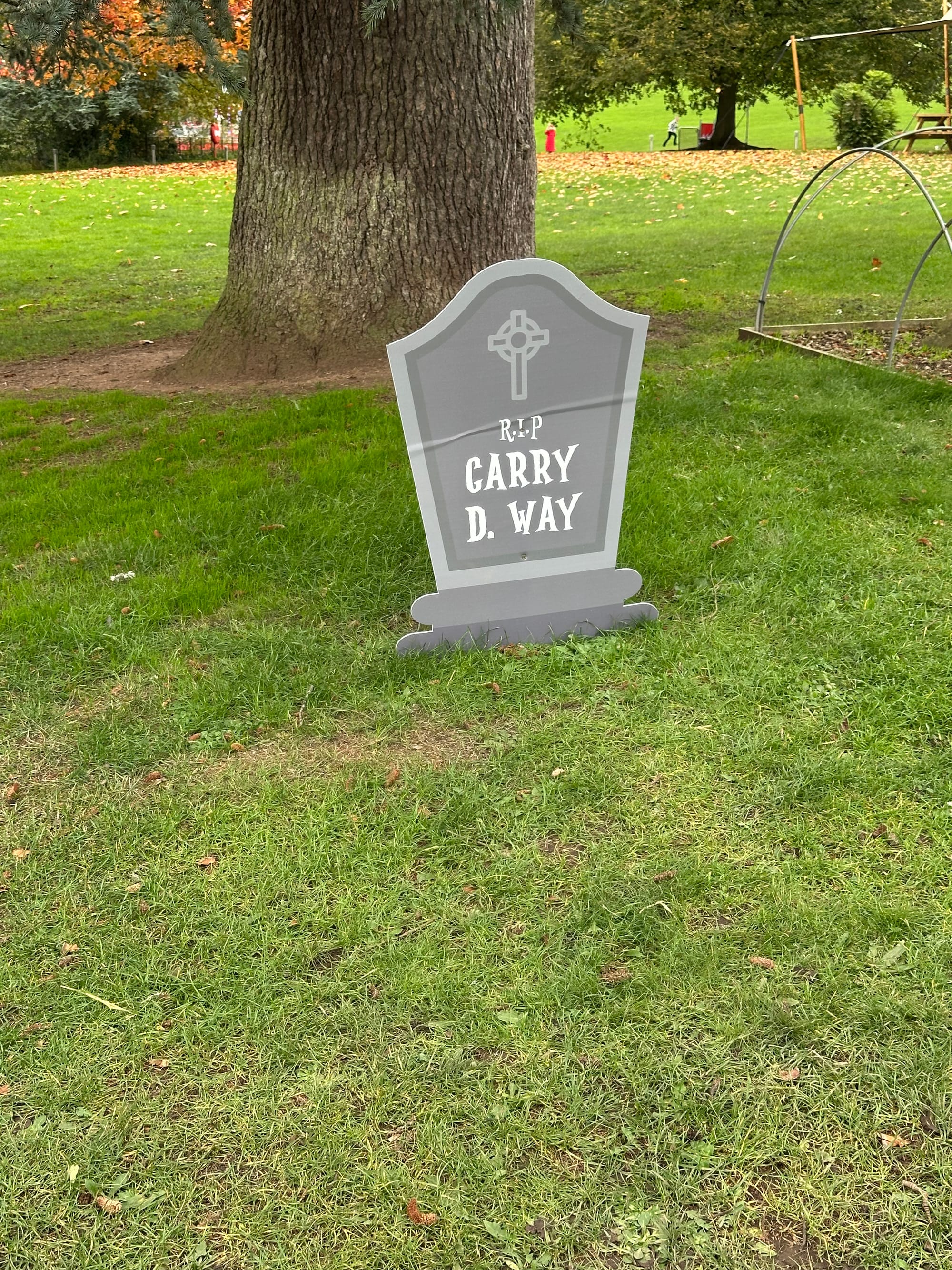 It wasn't the warmest of days, so we went to get the obligatory hot chocolate. At the side of the path on the way to the kiosk where you can buy hot chocolate, were a series of "gravestones" with really corny inscriptions on them. In a way, they were kind of reminiscent of the corny inscriptions on the headstones if you're going on the Haunted Mansion ride at Disney.